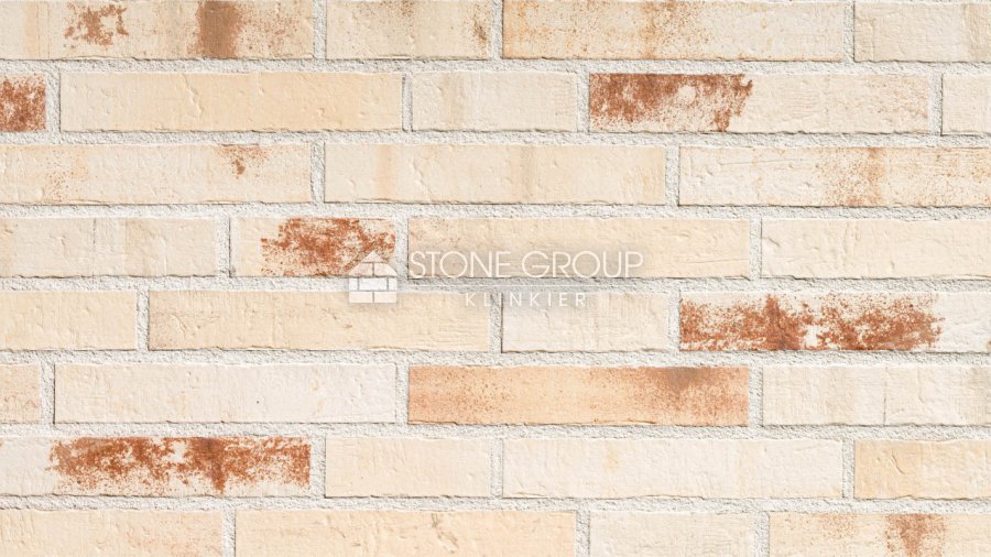 Model Lugana charakteryzuje się bardzo jasną, kremowo-beżową bazą (odcień jasnego piasku), która jest silnie urozmaicona nieregularnymi, rdzawymi, miedzianymi i jasnobrązowymi przebarwieniami. Te intensywne, ciepłe detale tworzą na ścianie wyraźny melanż. Płytka ma zmatowioną powierzchnię, lekko nieregularne krawędzie i widoczne na licu drobne pory oraz żłobienia, co nadaje jej autentyczny wygląd tradycyjnie wypalanej cegły.